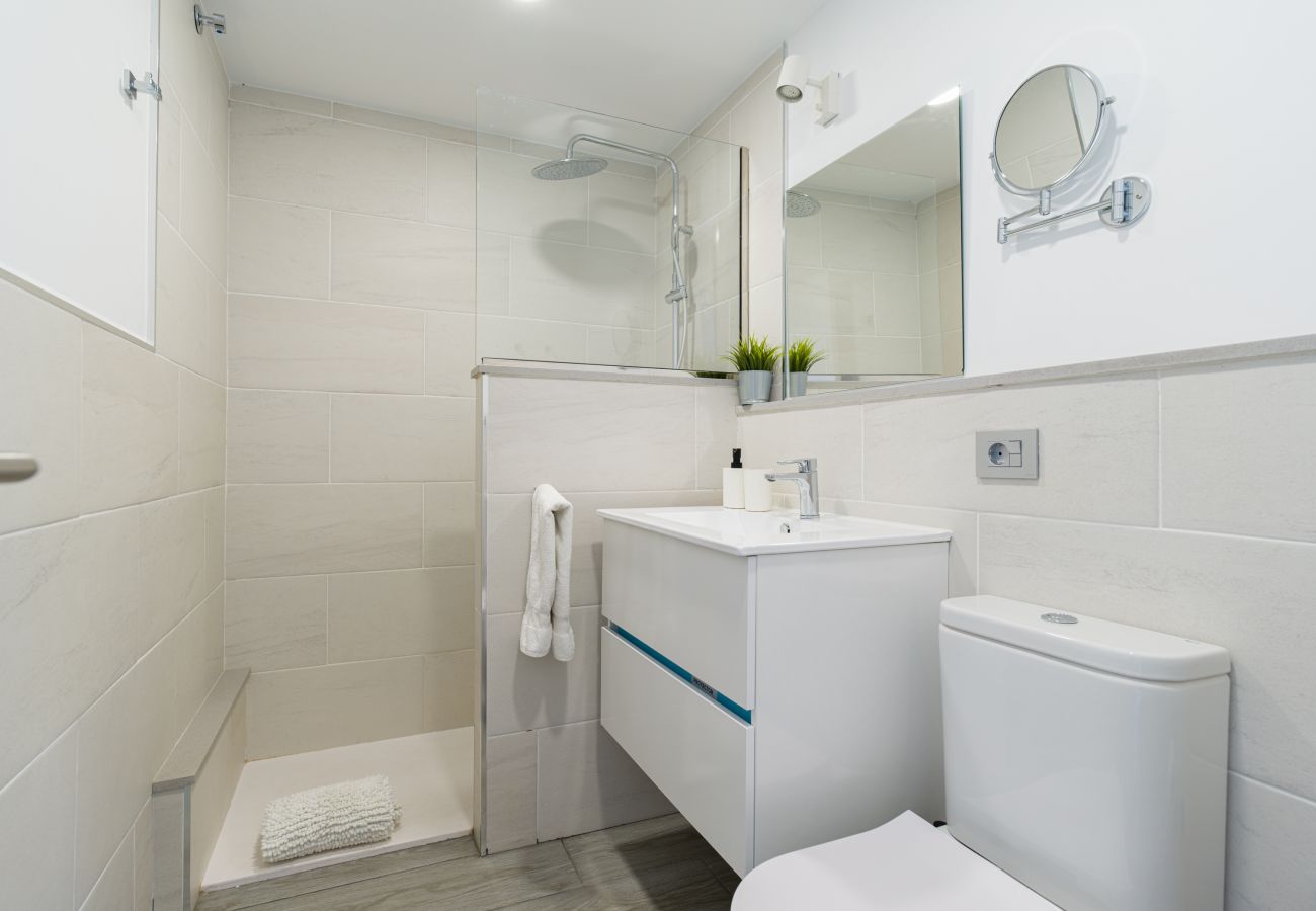 El baño completo es muy cómodo, con mucha luz, un amplio espejo al igual que el lavamanos, con plato de ducha, lavadora, secador de pelo y espacio para almacenaje.