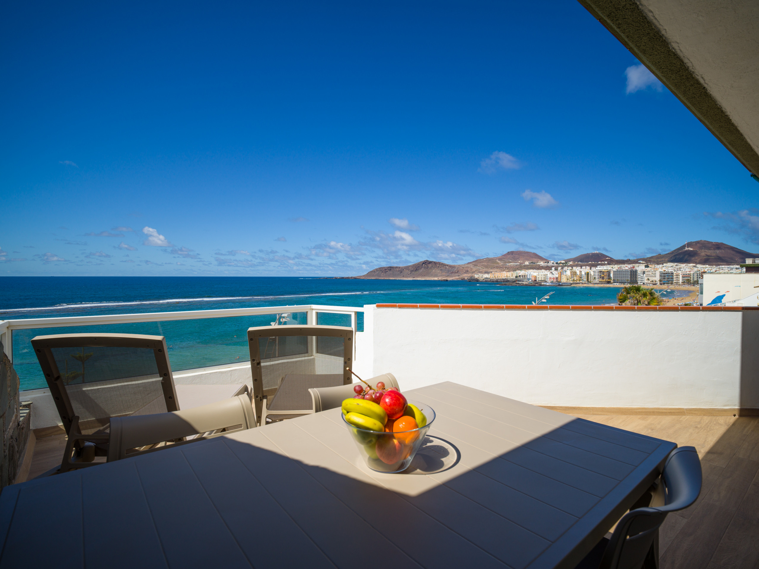 1. **Panoramablick:** Genießen Sie den atemberaubenden Panoramablick auf den Atlantischen Ozean und die malerische Nachbarschaft von der geräumigen privaten Terrasse. Ein perfekter Ort, um sich zu entspannen und die Schönheit Gran Canarias zu bewundern.